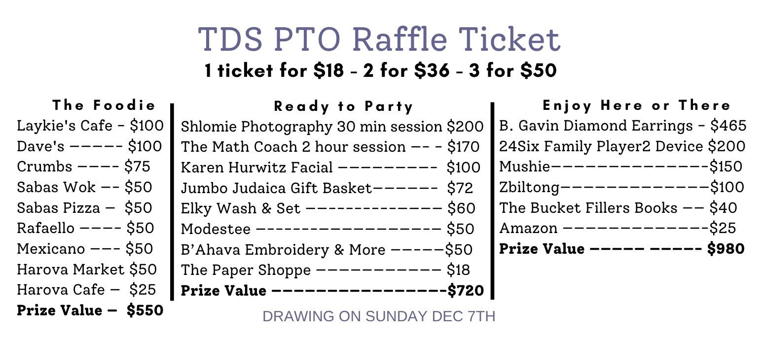 Package #1: Brian Gavin Diamonds-$465, Harova Cafe-$25, Laykies Cafe-$100, Rafaello-$50, Sabas Wok-$50, The Math Coach-2 hours math coaching, Wigs by Elky- Wash & set-$60. Package #2: Amazon gift card-$25, Crumbs-$75, Mexicano-$50, Sabas Pizza-$50, Schiffi Scheff embroidery-$50, Shloimie Nathanson Photography-30 min.session/$200 value, The Paper Shoppe-$18. Package #3: Dave’s Crunch House-$100, Facial by Karen Hurwitz-$100, Harova market-$50, Jumbo Judaica gift basket-$72, Michal wigs- Modestee gift card-$50, Mushie-$100, Rivka Fishman-The Bucket Filler combo books, Zbiltong-$100.